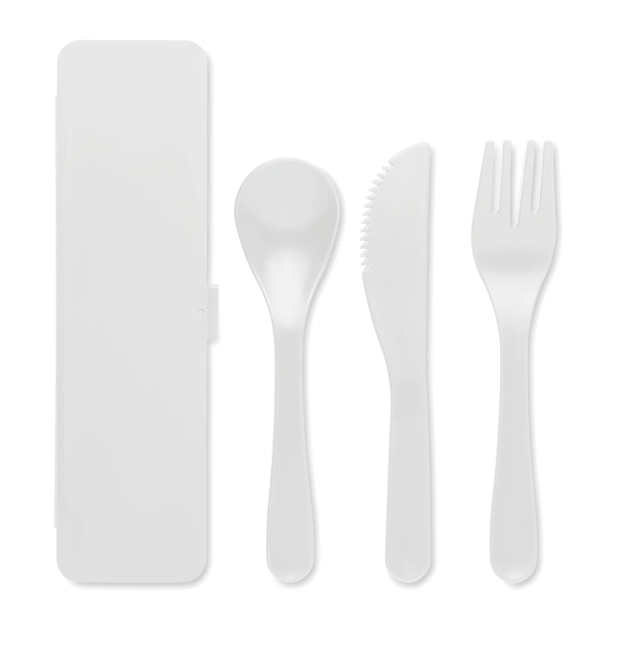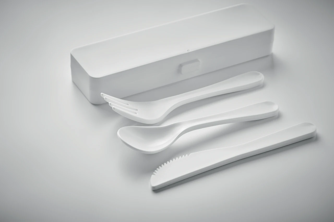 Комплект от 3 прибора от полипропилен (вилица, нож и лъжица) с кутия в съответстващ цвят.