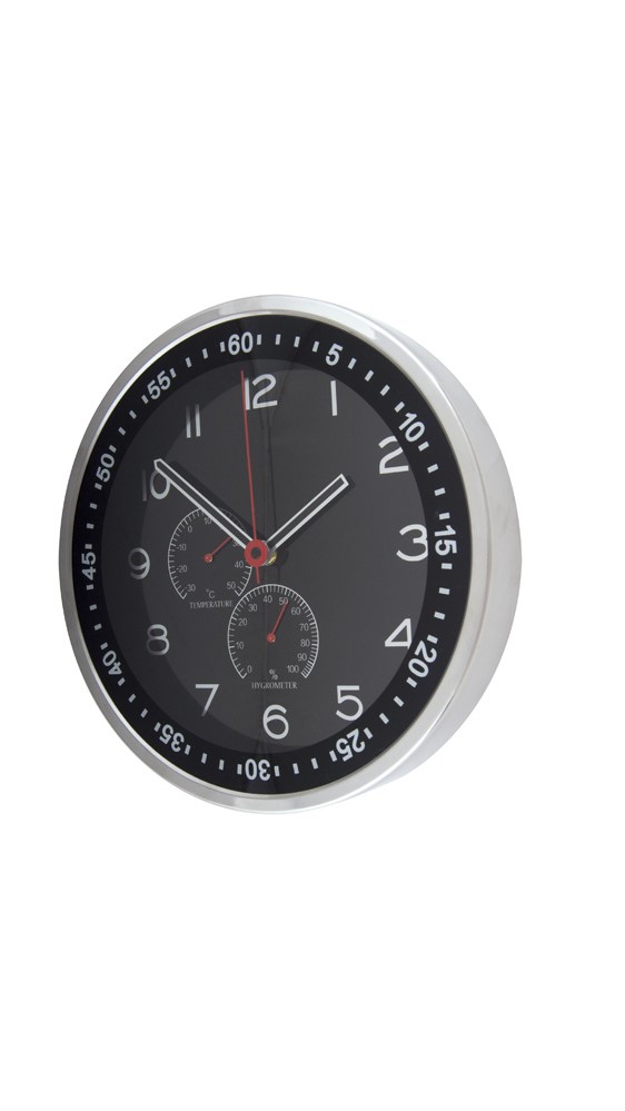 Стилен стенен часовник от метал с термометър и хигрометър за измерване на влажността. Механизмът на стрелките е плавен - "sweep".