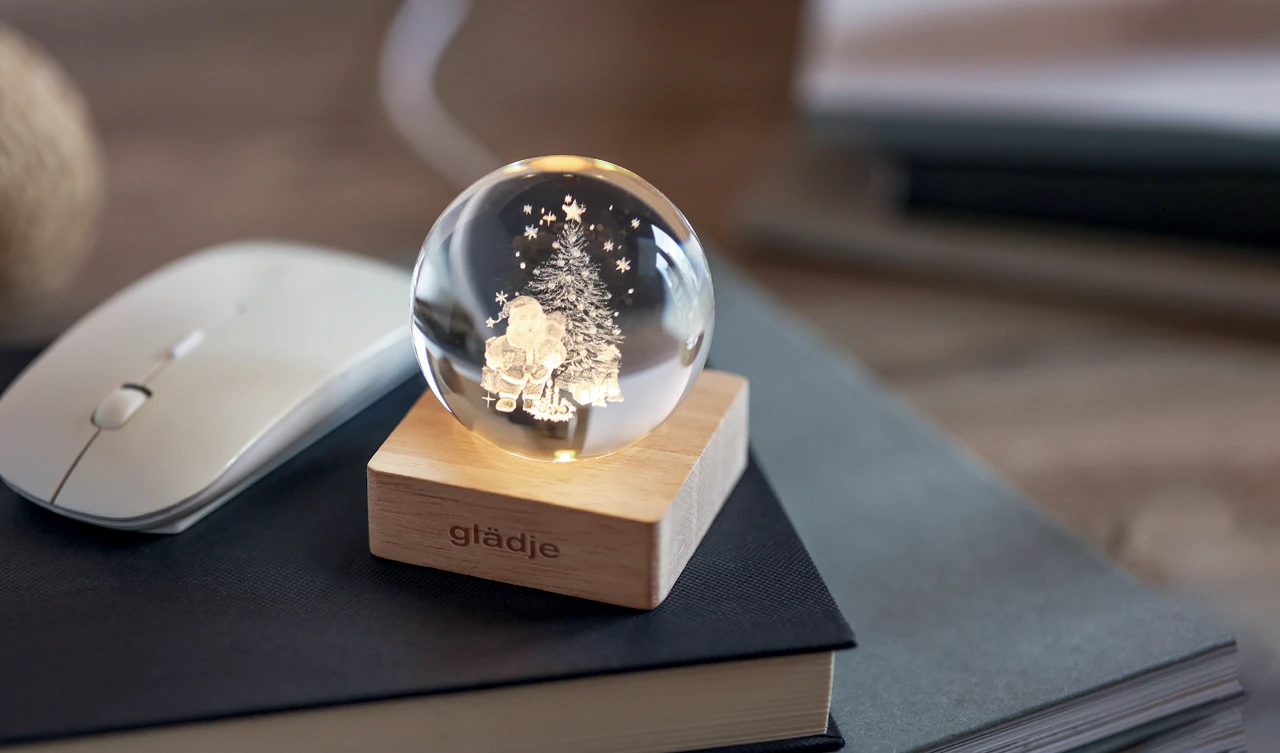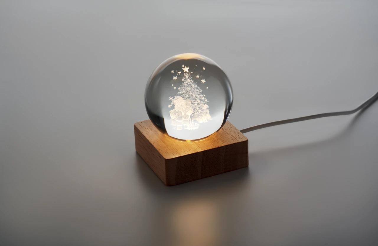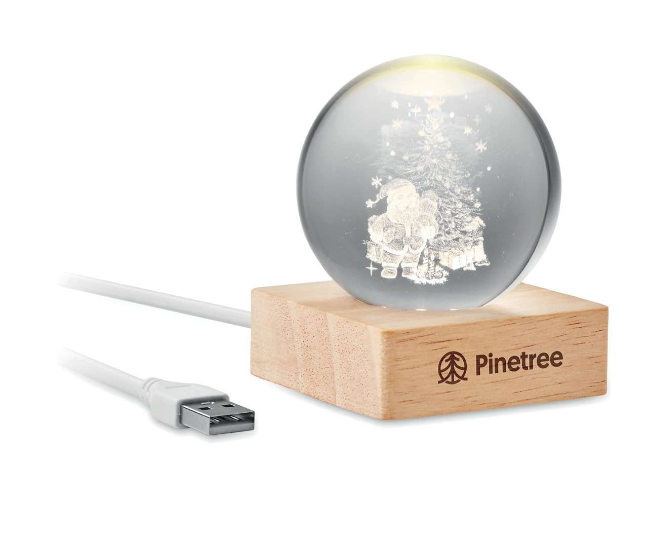 Стъклена коледна украса с LED светлина върху гумено-дървена основа. Включва USB кабел за зареждане (90 см)