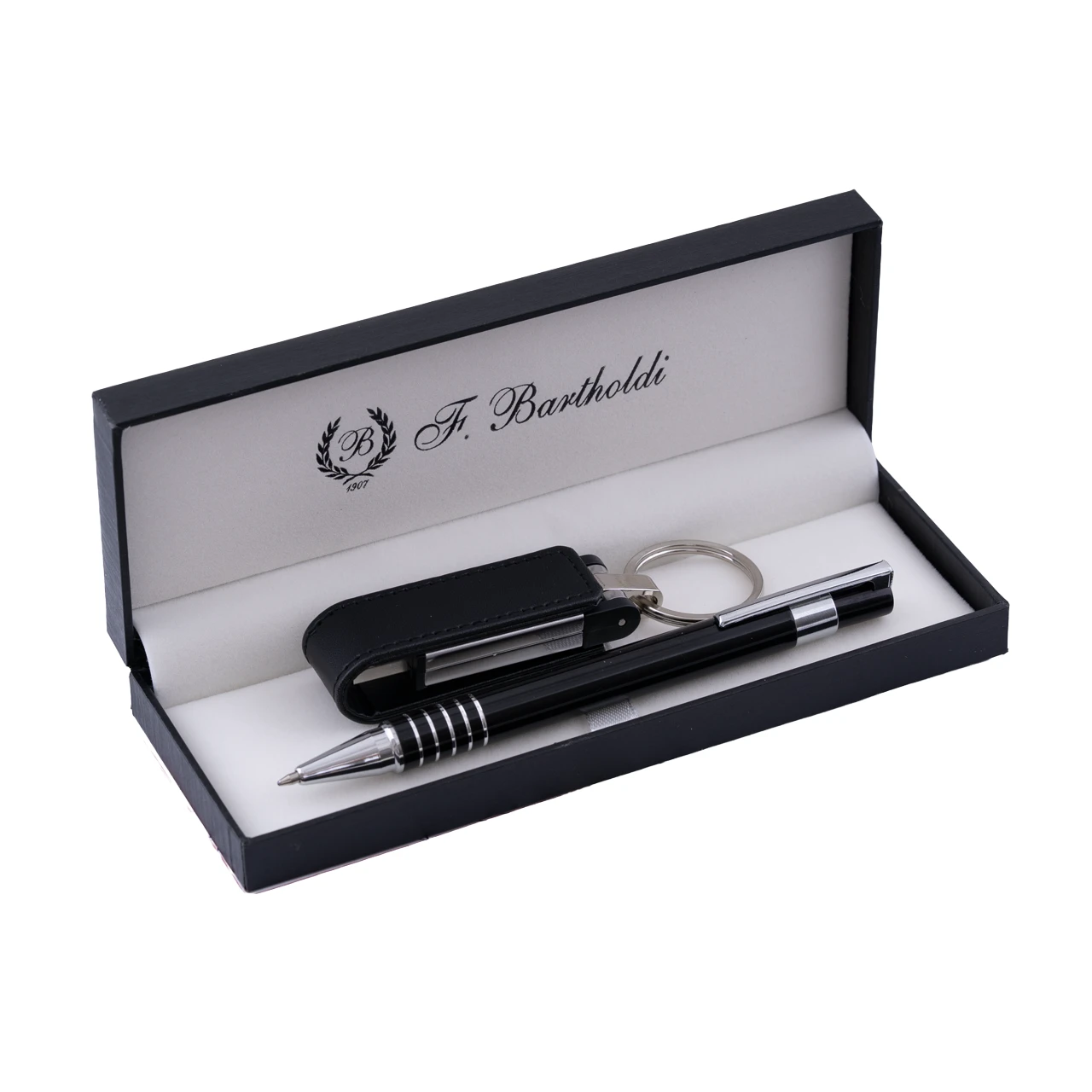 Луксозен комплект съчетаващ метална химикалка и USB кожена флашка с капацитет 32GB.