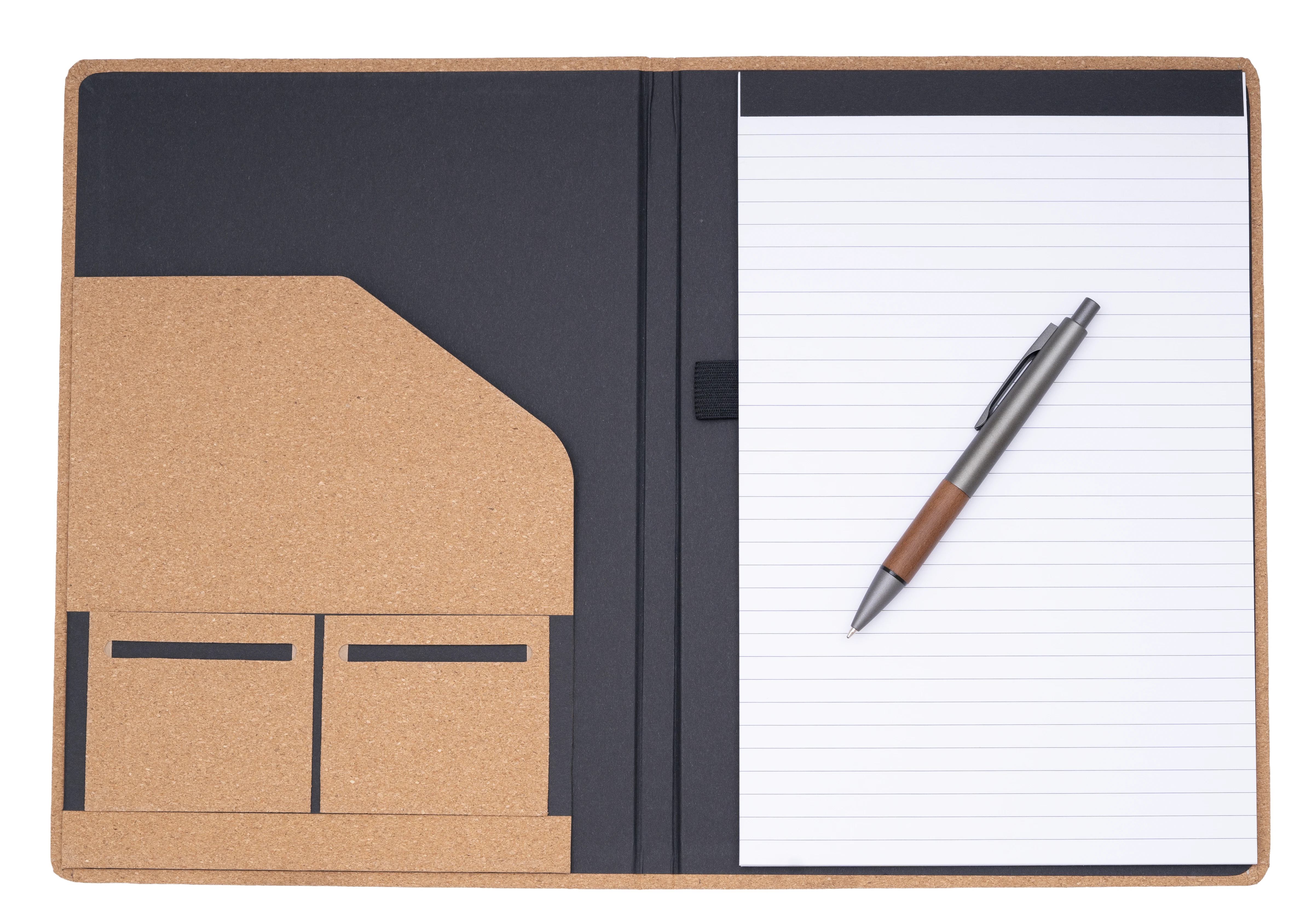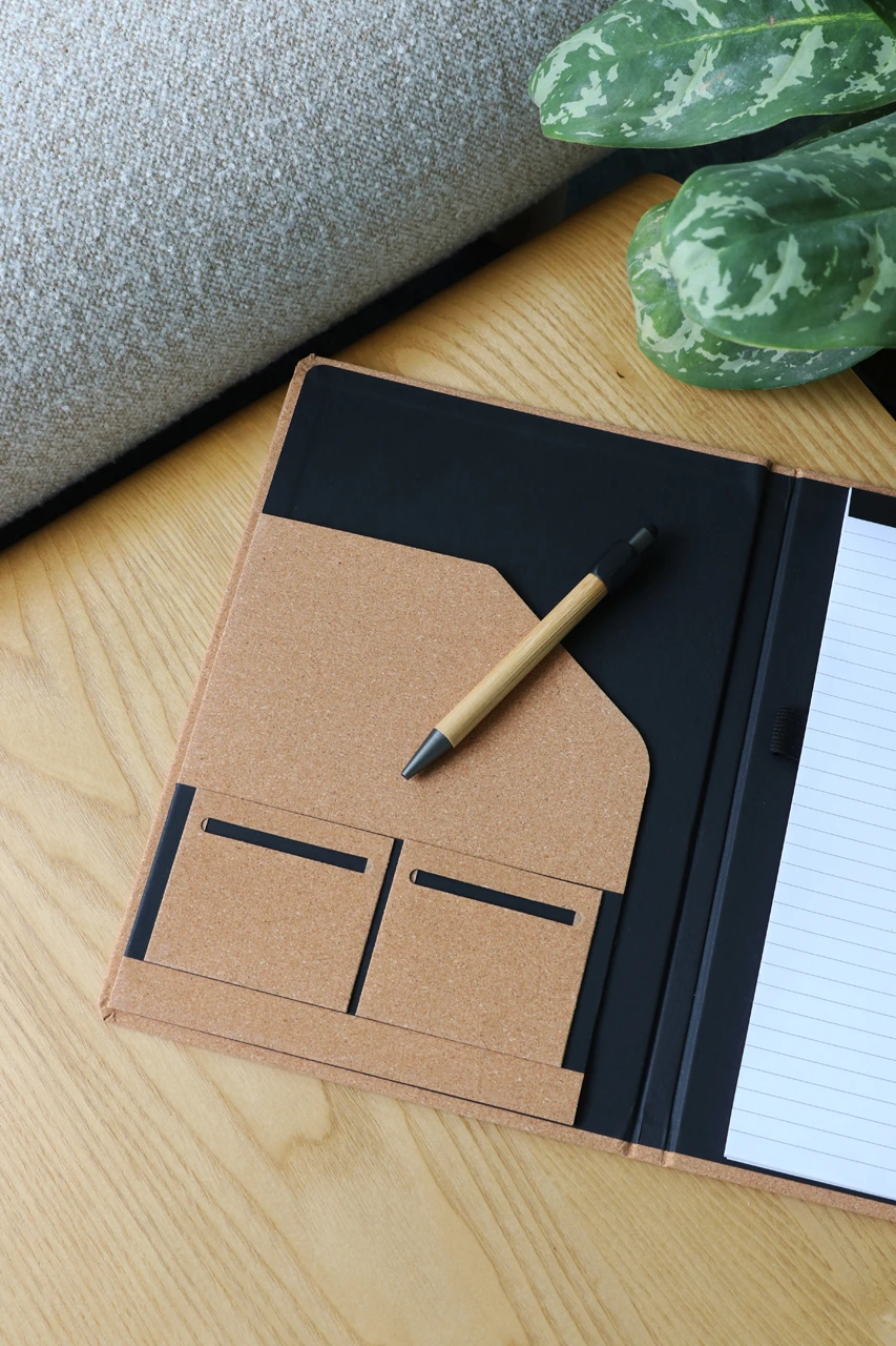 Конферентна папка от корк А4. Бележник А4 с възможност за многократно пълнене. 30 линирани листа от рециклирана хартия. Съдържа ластик за химикалка, два джоба за карти и едно голямо отделение.