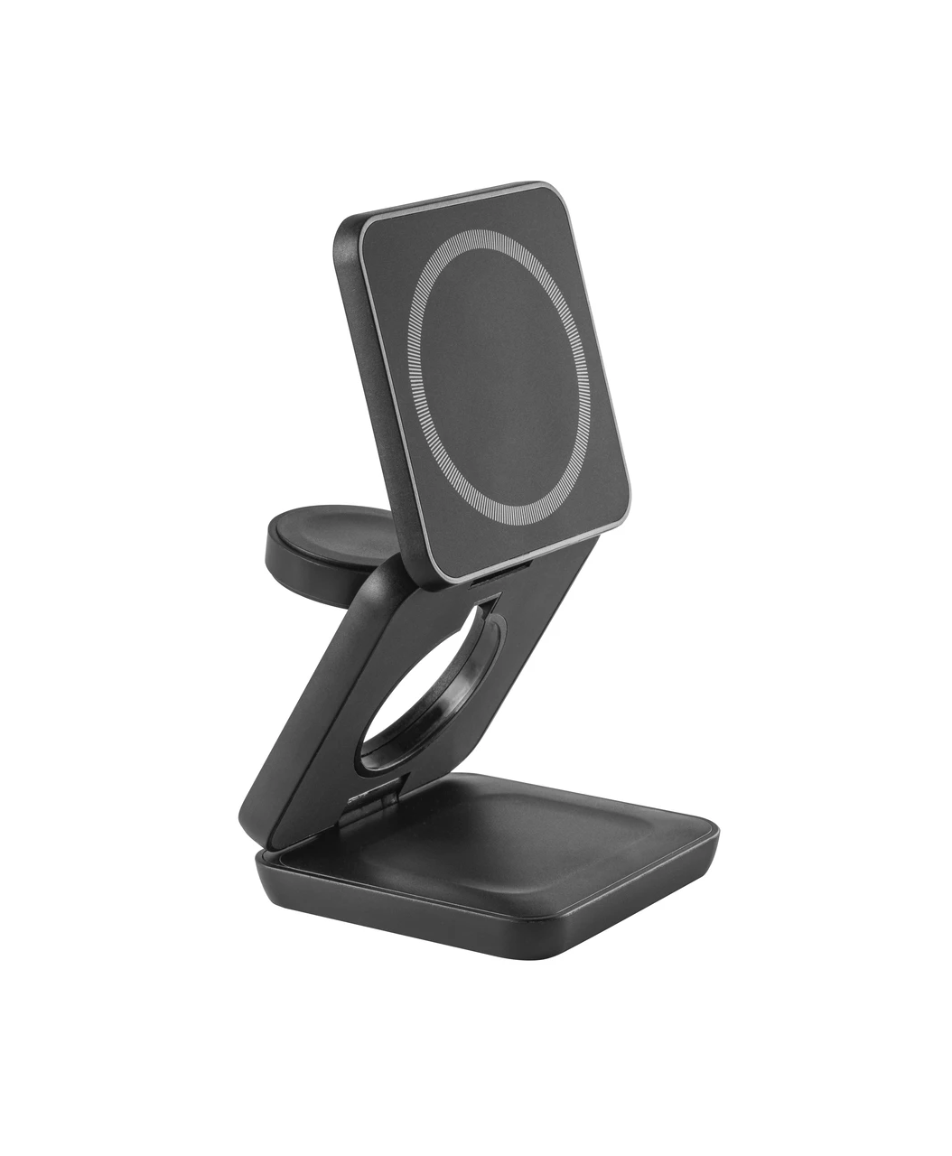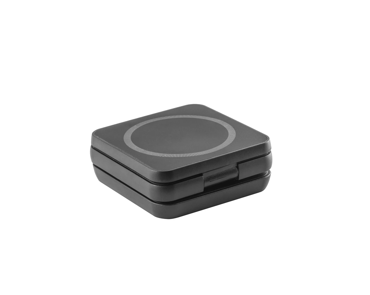 Компактно сгъваемо зарядно устройство за едновременно зареждане на до три устройства: смартфон (15W), слушалки (5W) и часовник (2,5W). Изработено от 100% рециклирана ABS пластмаса, с магнитна плоча за стабилно закрепване на телефона. Включва USB-C кабел и допълнителен магнитен пръстен за устройства без вграден магнит. Доставя се в еко-опаковка от крафт хартия