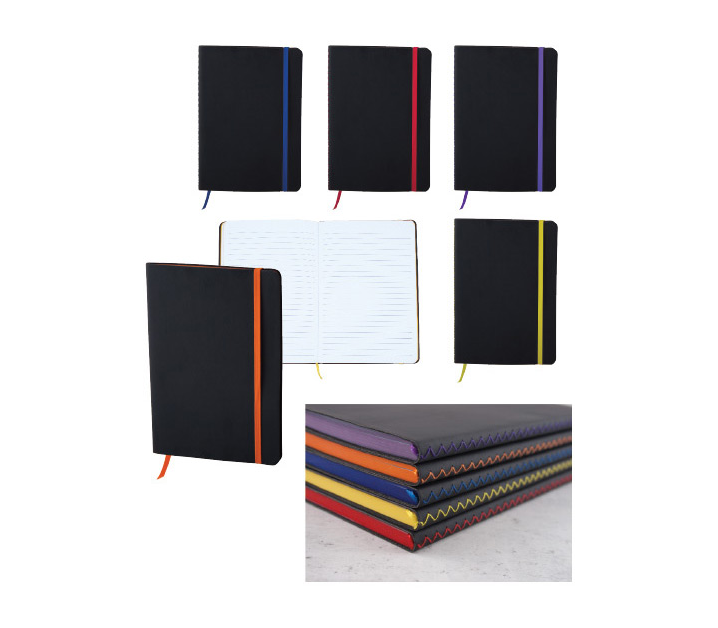 Тефтер A5 с ластик и разделител, 80 листа с редове, цвят на хартията бял с цветен ръб, мека корица с декоративен цветен шев. Материал: PU, хартия. Размер на артикула: 147х210х13 mm. Печатаемо поле: 60х60 mm. Печат: тампонен, ситопечат, гравиране, сухо преге
