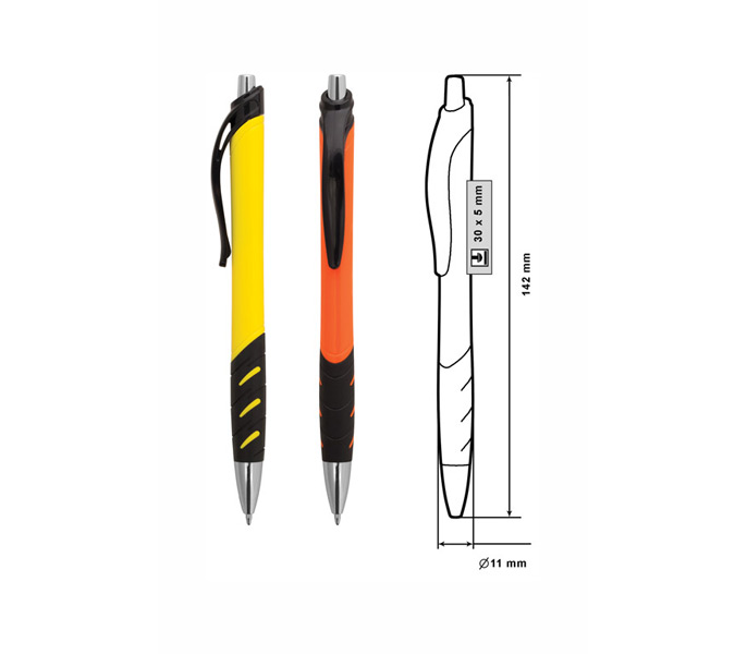 Химикалка, пълнител обикновен. Материал: пластмаса. Размер на артикула: Ø11х142 mm. Печатаемо поле: 30х5 mm. Печат: тампонен. Опаковка: 50 бр. в кутия/1000 бр. в кашон. При поръчка, количеството да е кратно на 50 бр.