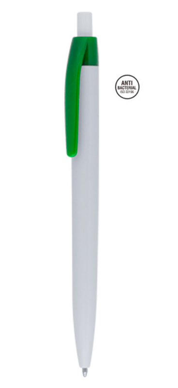Антибактериална химикалка, пълнител обикновен. Материал: пластмаса. Размер на артикула: Ø10х140 mm. Печатаемо поле: 45х6 mm. Печат: тампонен, ситопечат. Опаковка: 50 бр. в кутия/1000 бр. в кашон. При поръчка, количеството да е кратно на 50 бр.